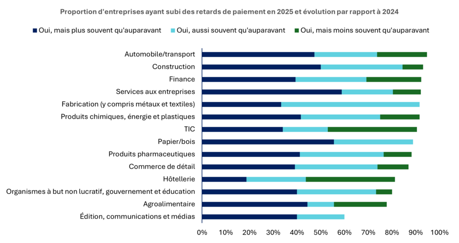 L’étude met en évidence des disparités importantes entre les secteurs. La constructionet l'automobile/transport sont les plus touchés par l'augmentation des retards de paiement (respectivement 95% et 93%), tandis que l'édition, les communications et les médias (60%), l'agroalimentaire (78%) et les organisations à but non lucratif, les administrations publiques et l'éducation (78%) signalent moins de problèmes. Cela s'explique souvent par des délais de paiement plus longs dès le départ ou une discipline plus stricte des acheteurs.